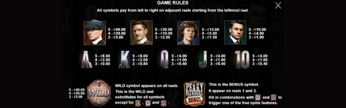 If you are a fan of Peaky blinders on Netflix then you are going to love four characters that you can find in the game. There are also the letters A, K, Q, J, and the number 10 to add more chances of winning different combinations.